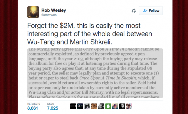 Hetki sitten kävi ilmi, että lääketeollisuudesta rahansa hankkinut Martin Shkreli on se tyyppi, joka osti yhden kappaleen painoksena toteutetun “salaisen” Wu-Tang-albumin huikealla kahden miljoonan dollarin summalla. Koko tapaus on jo itsessään kiinnostava, mutta lisämutkan siihen toi hetkeksi erään Rob Wesleyn twiitissään alulle pistämä huijaus. Wesley postasi twiittinsä mukana kuvan, joka näyttäisi olevan osa sopimuspaperista. Kuvan teksti kertoo, kuinka Wu-Tangin jäsenet tai Bill Murray ovat ainoita henkilöitä, jotka ovat oikeutettuja järjestämään “ryöstökeikan”, jolla levy voidaan käydään hakemassa takaisin ilman lainseuraamuksia.