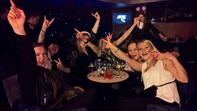 Illan alkutunnelmat olivat railakkaat. Sieltä sun täältä kuului biletyshuudahduksia ja kovaa naurua. Tax-free-myymälä täyttyi matkustajista sekunneissa ja karaokeen muodostui hetkessä pitkä laulujono. Matkustajaryhmä oli valmis bailaamaan.