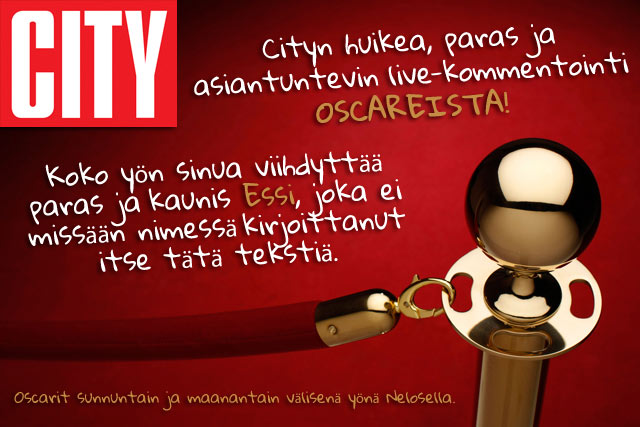 Sunnuntain ja maanantain välisenä yönä jaetaan taas elokuvamaailman tärkeimmät pystit. City tarjoaa lukijoilleen mahdollisuuden seurata Oscareiden jakoa ja kultaisten patsaiden ympärille rakentuvaa ilmiötä omasta vinkkelistään. Seuranta tapahtuu Cityn live-kommentointi Oscareista Facebook-sivulla.