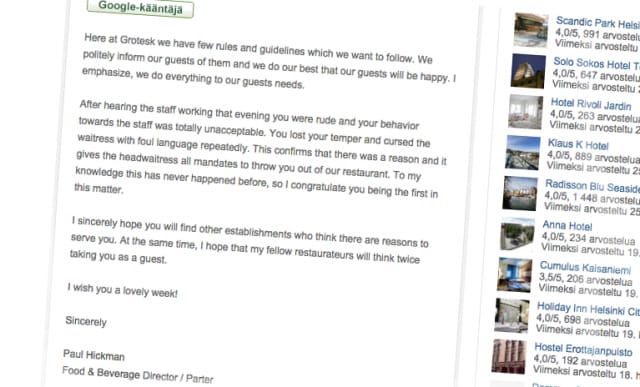 Näin kävi hetki sitten, kun ravintola Groteskin ravintolatoimenjohtaja Paul Hickman ei suostunut purematta nielemään ravintolansa saamaa palautetta. Asiakas haukkui koko paikan lyttyyn, koska ei saanut tilattua pöytäryhmälle tarkoitettua maistelumenua vain puolelle seurueesta. Palautteen perusteella porukka oli tämän jälkeen heitetty syyttä suotta ulos ravintolasta. Hickman servasi asiakkaan vastauksessaan kertomalla hänen olleen röyhkeä, ylimielinen ja alatyylinen räyhätessään tarjoilijalle, ja että ravintolasta poistamiselle todellakin oli syytä. Maistelumenun jakamissäännöstä voi olla montaa mieltä, mutta tarjoilijan huorittelun unohtaminen omasta kertomuksesta kääntää koko asetelman päälaelleen. Etenkin, kun Hickman on sanonut, että maistelumenun jakaminen on mahdollista asiallisesti sovittaessa.