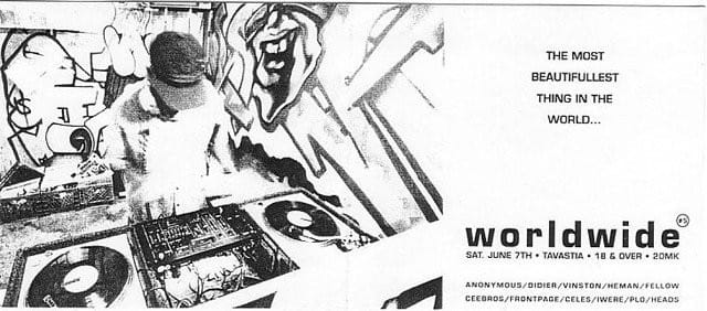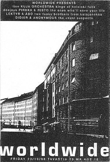 Olin itse jo sen verran vanha, että pystyin aloittamaan bileiden järkkäämisen. Ensin oli muutamia kokeiluja ympäriinsä, mutta 1996 joulukuussa oli ensimmäiset Tavastian Worldwidet. Me ei tiedetty promotoinnista oikeastaan mitään. Tehtiin tuhat flyeria ja jaettiin ne jonnekin, ja Tavastia oli melkein täynnä. Se lähti aika nopeasti ja siitä tuli ihan vakkarijuttu. Iltoja oli parin kuukauden välein, säännöllisen epäsäännöllisesti. Ennen pitkää alkoi tulla myös ulkomaisia artisteja."
