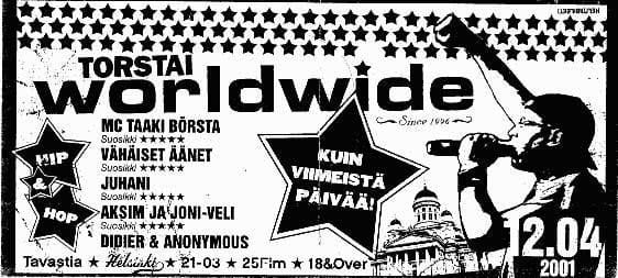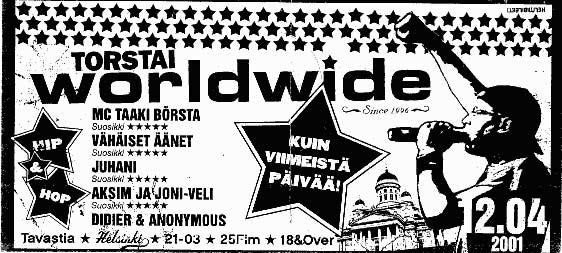 Worldwide oli legendaarinen räppiklubi, jota pyörittivät DJ Anonymous ja Didier Selin vuodesta 1996 eteenpäin. Ysärin puolivälin jälkeen aika alkoi olla kypsä kunnon hip hop -klubille ja Worldwide onnistuikin vetämään Tavastian usein täyteen. Räppäreistä Worldwiden lavalla kotiutuivat Ceebrolistics ja Davo (silloinen Celes) yhdessä MC Taakibörstan kanssa. Legendaarisiin battleihin Worldwiden lavalla kuuluu muun muassa Ruudolfin ja Asan kohtaaminen freestylen merkeissä.