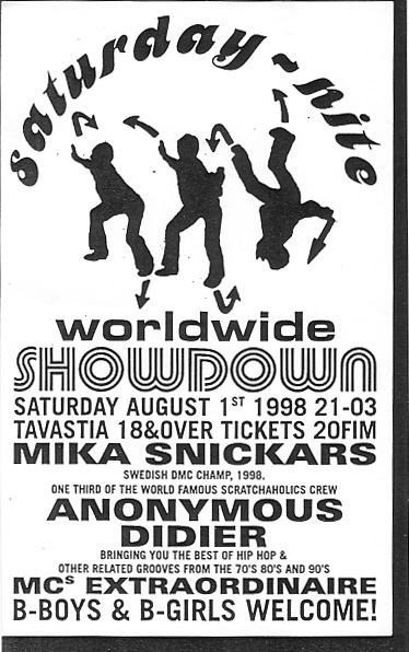 Tavastialle mahtuu 800-900 ihmistä ja kyllä se meillä oli ajoittain täynnä, vaikkei ihan aina lippuja loppuun myytykään. Kotimaisia artisteja oli sen verran vähän, että samat tyypit olivat säännöllisesti lavalla ja saatiin Didierin kanssa haalia DJ:tä kasaan ihan huolella. Kyllä me yritettiin, Tampereelta tuli jotain tyyppejä ja ensimmäisiä suomeksi räpänneitä tuli ympäriinsä. Ceebrolistics oli siellä melkein jatkuvasti.