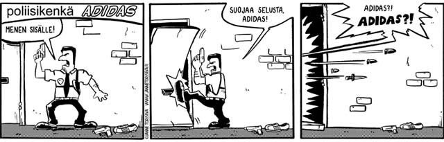 Kuten monet ovat huomanneet, Cityn uudistus toi saitille uuden sarjakuvan. Poliisikenkä Adidas ei ehkä ole poliiseista parhain, mutta kengäksi varsin kova kaveri.