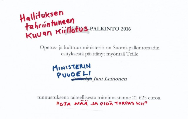 ”Koska Suomi-palkinnon jakaa Suomen valtio, tarkemmin Opetus- ja kulttuuriministeriö, koen sen edustavan myös niitä kenen käsissä valta Suomessa nyt on, hallituspuolueita, ministereitä, ja kenen etuja he nyt ajavatkin. Ottaessani palkinnon vastaan voin luvata vain tekeväni parhaani, ettei tämä palkinto vaikuta kykyyni olla kriittinen niitä kohtaan, joilla on valtaa. Kiitos.”