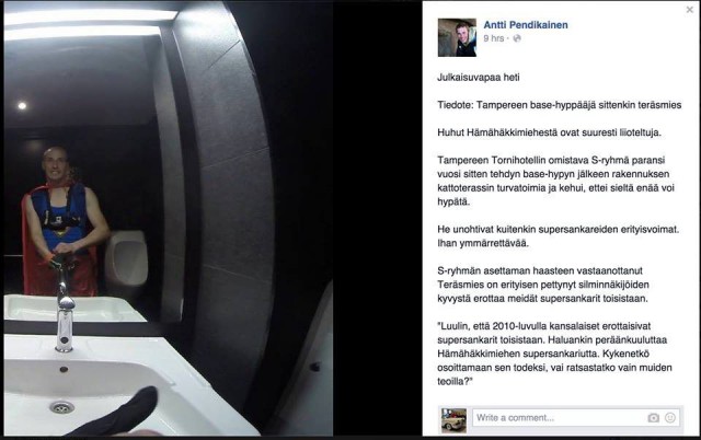 Tampereen Sokos Hotel Tornista hypättiin vuosi sitten marraskuussa base-hyppy ja hotellinjohtaja ilmoitti, että terassi pistetään kiinni, kunnes turvallisuutta on parannettu. Näin tehtiin. Stunt Freaks Teamin huimapäisistä tempauksista tuttu Antti Pendikainen otti turvatoimien parantamisen haasteena ja kertoi niiden rikkomisesta Facebook-sivullaan.