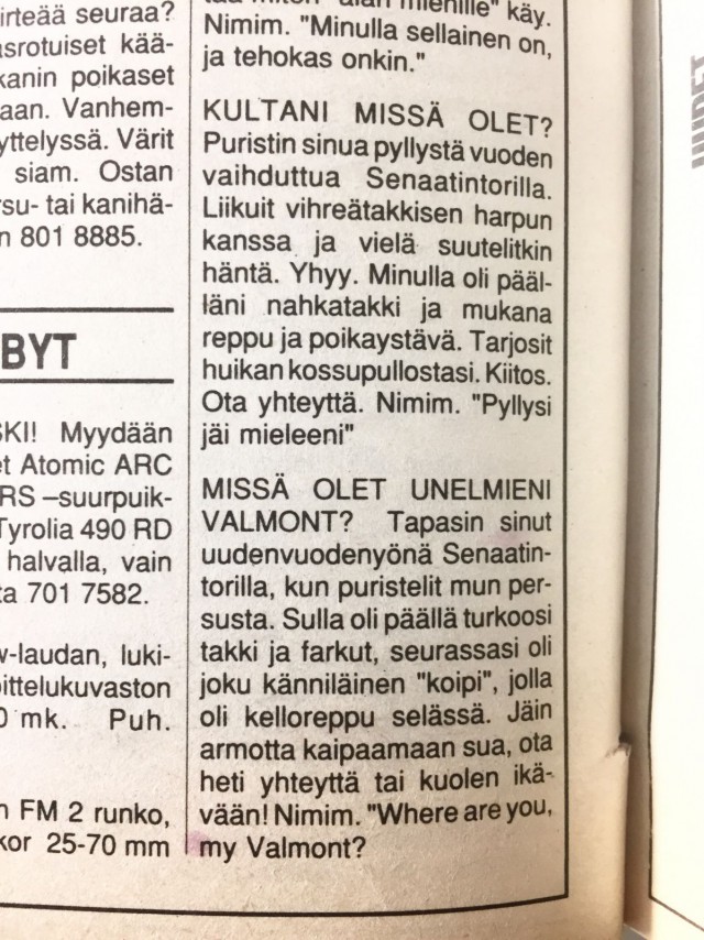 Cityn ilmoitustaulu palveli kolmella vuosikymmenellä lukuisia tarkoituksia: ilmoituksissa etsittiin vuokra-asuntoja, ostettiin ja myytiin soittimia ja c-kasetteja sekä läheteltiin tietysti terveisiä. Moni rakkaustarina sai siellä alkunsa tai tyrehtyi ennen syntymistään. Ja kenties parasta antia olivat etsintäkuulutukset, joista moni toivoi löytävänsä itsensä. Kuten nämä kaksi, pyllyn puristelija ja sen omistaja vuonna 1990: