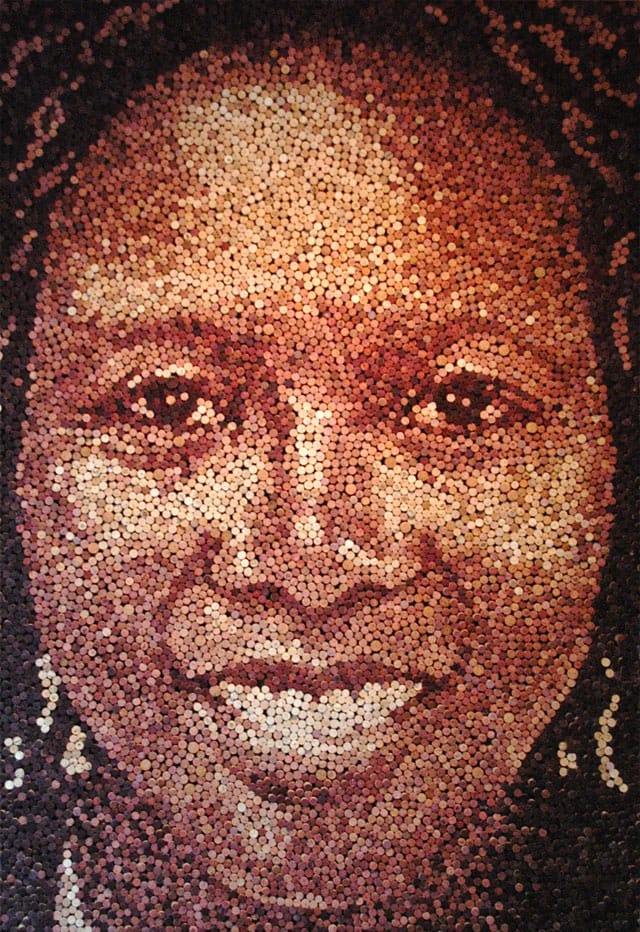 Michiganin osavaltiossa Yhdysvalloissa asuva kuvittaja-taiteilija Scott Gundersen on tehnyt tuhansista käytetyistä viinipullojen korkeista jättiläismäisiä muotokuvia.