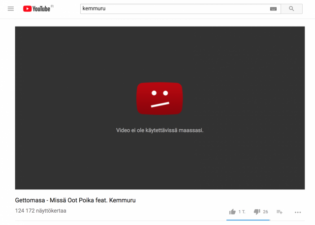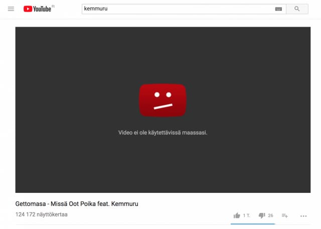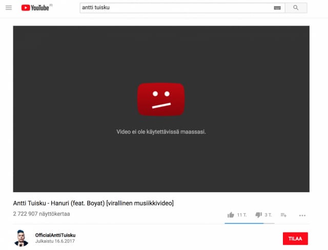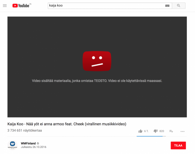 “Tietyistä kappaleista” puhuminen kuulostaa nopean tarkistuksen perusteella vähättelyltä. Tietysti vaikka kaiken suomalaisen musiikin poistaminen on Youtuben kokonaisuudessa pieni juttu, mutta suomalaiseen musakenttään rajoitus näyttää osuvan täysmääräisesti. Poistuneiden listalta löytyy artisteja Almasta Antti Tuiskun kautta Kaija Koohon ja levy-yhtiöitä pienimmistä suurimpiin.