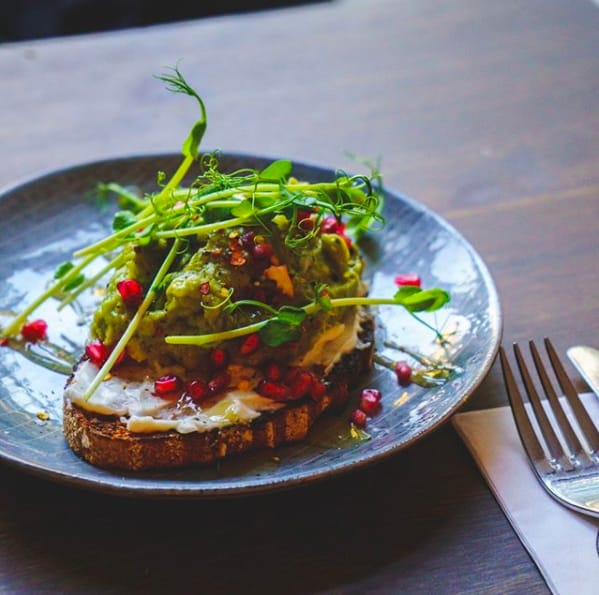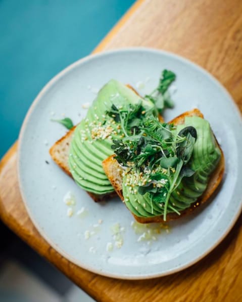 Useita vaihtoehtoja, kuten avokado-toast (6 €) tai jogurtti granolalla (5 €).