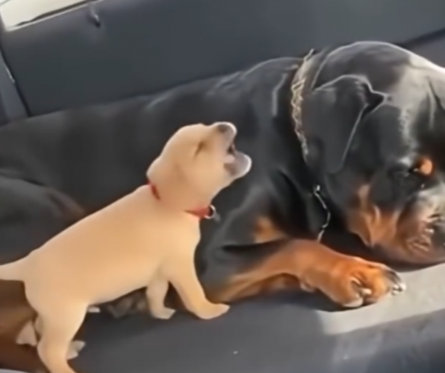 Takapenkillä tilannetta seuraa pentua selvästi kokeneempi ja rauhallisempi isompi koira. Se ei puutu asiaan heti, vaan antaa ensin pennun pitää oman shownsa. Lopulta sille riittää: koira nostaa kuononsa, päästää yhden matalan, napakan haukahduksen – ja tapahtuu jotain uskomatonta.