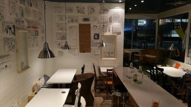 Annosta odotellessani saan esittelykierroksen paikan koristeltuihin seiniin. Galih kertoo, kuinka kaikille asiakkaille tarjotaan mahdollisuutta jättää positiiviset terveiset raflan seinälle tussilla paperille piirtämällä. Seinille kiinnitetyistä arkeista löytyy paljon kiinnostavia tarinoita. Yllättävän monella viestin jättäneellä on yhteys Balille. Lasten ja lastenmielisten piirrosten ja viestien näkeminen viihdyttää ja ne tuovat paikan sisustukseen oman musta-valkoisen ja yllättävän tyylikkään ilmeen.