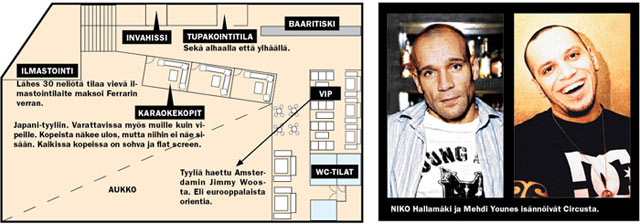 Omin lompakoin eivät Niko ja Mehdi ole liikkeellä: ravintolan taustalla on muun muassa samoja rahoittajia kuin Tampereen ja Lahden Love Hotel -yökerhoissa ja Jyväskylän Kharmassa. Tampereen Love Hotelissa on jo ihmetelty Circukseenkin tulevia japanilaistyylisiä karaokekoppeja. Kopit ovat Japanissa todella yleisiä ja sellainen nähtiin myös Lost in Translation -elokuvassa. Seurueelle varattavista kopeista näkee ulos, mutta niihin ei näe sisälle. Japanissa koppeja käytetäänkin paljon lemmenhetkien viettämiseen. Circuksen kopin saa käyttöönsä koko illaksi 500 eurolla. Siihen sisältyy kymmenen hengen sisäänpääsy ravintolaan ja vip-tilaan sekä jonkin verran tarjoilua.