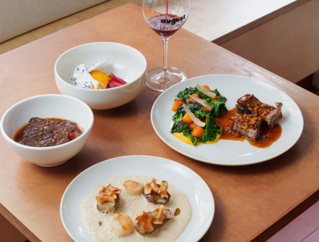 Menu sisältää alkuruoaksi tomaatticevichea punaisen mison ja korianterin kera sekä kampasimpukkaa maa-artisokalla ja mantelivaahdolla. Pääruoaksi nautitaan luuttomia naudanribseja kurpitsan ja aprikoosin kanssa. Menun kruunaa mantelikerma-merengue kookoksen ja kauden hedelmien kera.