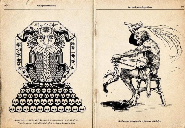 "Joulupukki vartioi metsästysmuistoksi ottamiaan lasten kalloja. Pinosta kasvoi joidenkin lähteiden mukaan Korvatunturi." ja toisella sivulla: "Vanhanajan Joulupukki ei piiskaa säästellyt."