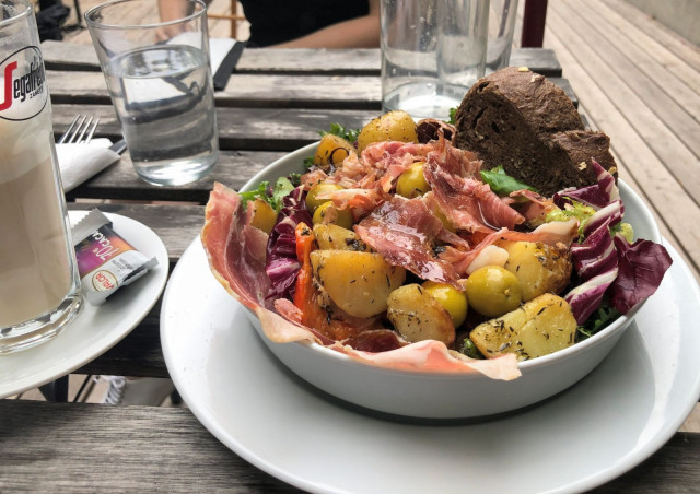 Pääsimme maistelemaan Cambera-salaattia, joka pitää sisällään muun muassa Serrano-kinkkua, marinoituja perunoita ja paahdettua paprikaa, munakoisoa ja oliiveja. Annoksessa maistui huolellisuus ja rakkaus raaka-aineita kohtaan, ja se jos mikä on enemmän kuin hyvä asia. Kun salaatin kanssa siemailee vielä lasillisen kuohuvaa iloiset asiakkaat ja vehreä ympäristö seuranaan, ei voi muuta kuin tykätä.