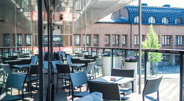 Holiday Innin terassilla voi nauttia niin juomasta kuin ruoastakin. Hampurilainen irtoaa parilla kympillä, kun taas lohiannos 22 eurolla. Plussakorteilla pääsee nauttimaan edullisista viineistä.