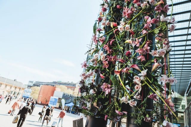“Kierrettävä kukkateosnäyttely on tapahtuman tunnusmerkki. Näyttelyssä on tänä vuonna 27 uniikkia kukkateosta, jotka levittäytyvät ydinkeskustassa aina Katajanokan Rakkaudensillalta Kaisaniemen kasvitieteelliseen puutarhaan saakka. Kierrettävän kukkateosnäyttelyn voi kulkea kerralla läpi tai valita itselle sopivan reitin teokselta toiselle".