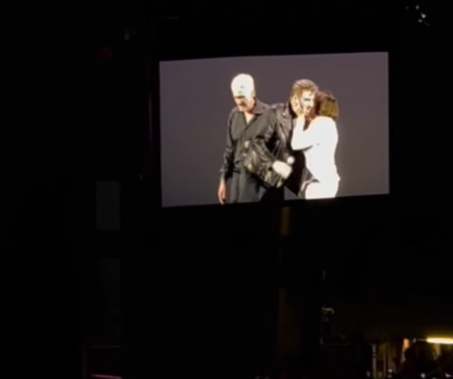 “L.A.? Luulin, että olit menossa takaisin Australiaan!” Travolta vitsaili yleisölle viitaten kuuluisaan repliikkiinsä elokuvasta. Hän esitti myös muutaman säkeen elokuvan loppulaulusta We Go Together, ennen kuin poistui lavalta ja antoi elokuvan alkaa.