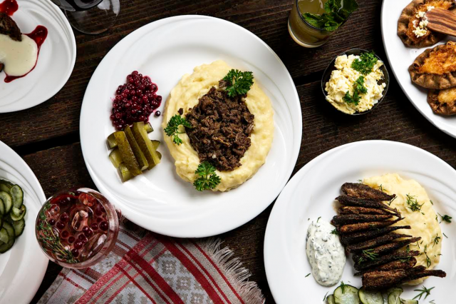 Alkuruoaksi nautitaan joko smetanalla höystettyä borssikeittoa tai pikkublinejä siianmädin kera. Pääruoaksi valittavana on joko ylikypsää karhua ja juureksia, pariloitua nieriää ja voi-valkoviinikastiketta tai sieniliemellä höystettyä sieniohrattoa. Aterian kruunaa tuulihattu valkosuklaavaahdon kera. Saatavilla on lisämaksusta myös juustoja.