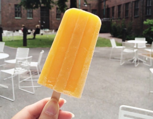 Terassi on kuin kiinnostavasta indie-elokuvasta (tai satukirjasta, riippuen mistä katsoo). Yhdessä pöydässä istuu iäkäs pariskunta, joka pitää toisiaan kädestä kiinni. Toisessa kaveriporukka lapsineen heittäytyy tämän tästä äänekkäisiin naurunremahduksiin. Oven vieressä istuu nuori nainen, joka syö punaisenkirjavaa jäätelöä ja lukee kirjaa. Varpuset leikkivät pensaissa. Täällä viihtyisi koko päivän.