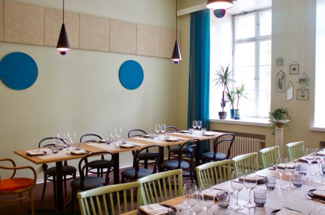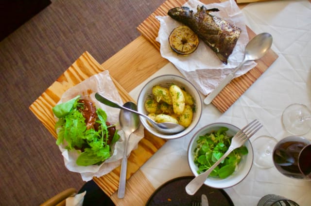 Entä sitten ruoka? Se on kekseliästä, raikasta, runsasta ja hyvää. Menu on mukavan suppea: alku- ja pääruokia on kumpaakin kolme ja jälkiruokia kaksi. Ruoassa suositaan lähituottajia ja sesonkiraaka-aineita, ja sen kanssa tarjoillaan tuoretta leipää. Annokset on suunniteltu siten, että ne ovat jaettavissa.