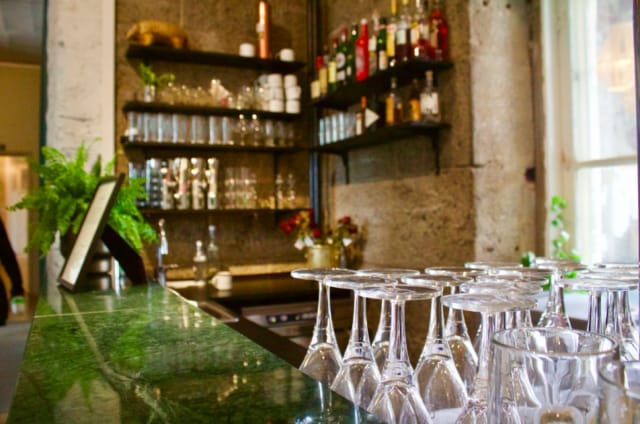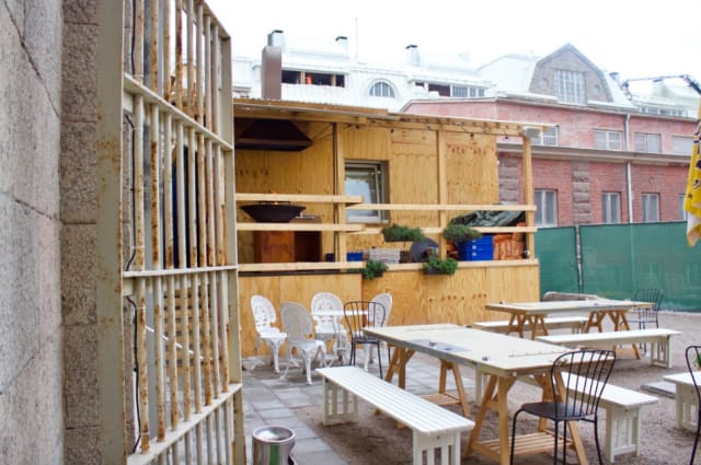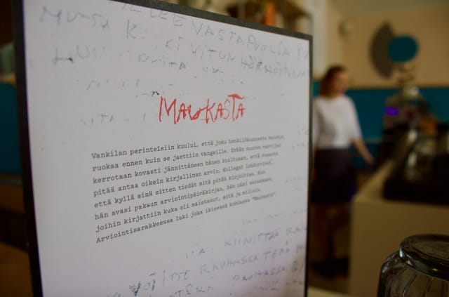 Menu on painettu paperille, jonka taustakuvana on aitoja vankilan seinäkirjoituksia. Kahvilan tiski on tehty vankien vanhoista postilaatikoista ja cocktaileja tarjoillaan tinamukeista. Alkuperäisiä kylttejä, kalteroituja portteja ja retoriikkaan sopivaa taidetta löytyy, kun osaa katsoa. Mutta muuten tunnelma on nykyaikainen ja kepeä, jopa kesäkartanonomainen.