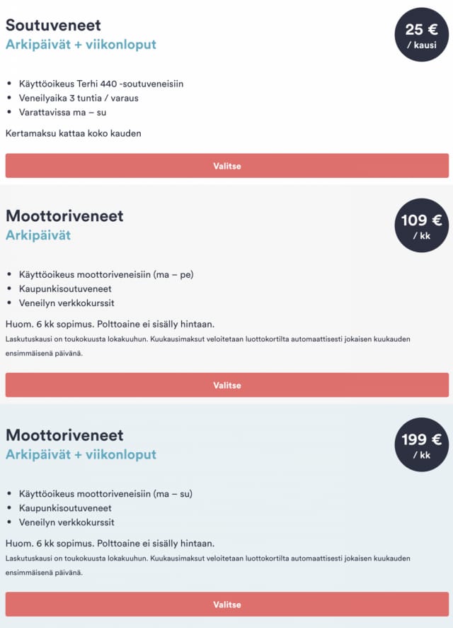 Skipperin veneitä voi käyttää kerrallaan kaksi tuntia ja ne varataan puhelimella. Palvelun kausimaksu oli Espoossa viime kesänä 20 euroa. Ensi kesäksi on kaavailtu kolmen tunnin maksimiaikaa ja 25 euron kausimaksua.