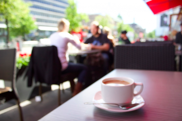 Kahvilalla on terassi, jonne asiantuntija vinkkaa pyrkimään heti aamusta.
