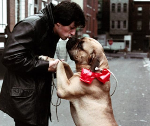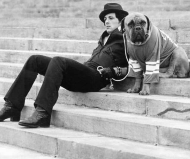 Vasta myöhemmin paljastuu, että mies on Sylvester Stallone, ja koira on Butkus, ikoninen bullmastiffi, joka päätyy Rocky-elokuvaan yhtä legendaarisena kuin omistajansa.