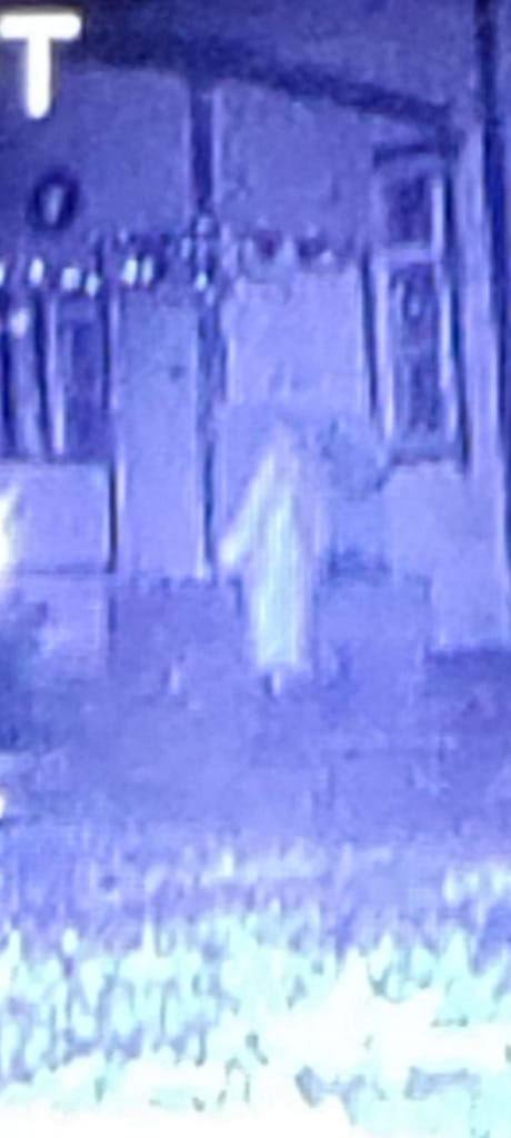 Kuvassa erottuu valkea hahmo pitkässä mekkomaisessa kaavussa. Kuvassa erottuu siis miehen makuuhuoneen ikkuna ja vasemmalla puolella on kuisti, missä mies epäilee hahmon käyneen koettamassa ovea. Mies epäilee olisiko hahmo tullut sisälle, jos ovi olisi jäänyt lukitsematta sinä yönä.