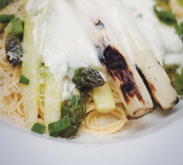 - Valkoista ja vihreää parsaa, parmesaanijuustoa, Linguine-pastaa