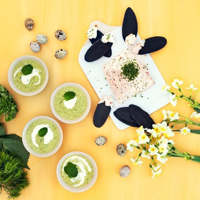 Pääsiäismenu sisältää alkuruoaksi parsakeittoa ja savulohirillettiä, pääruoaksi nautitaan haudutettua karitsanniskaa ja valkosipuli-yrttiperunoita. Ennen varsinaista pääruokaa nautitaan juustoja, jonka jälkeen aterian kruunaa rahka-tuorejuustobavaroise ja mango-ananaskompotti.