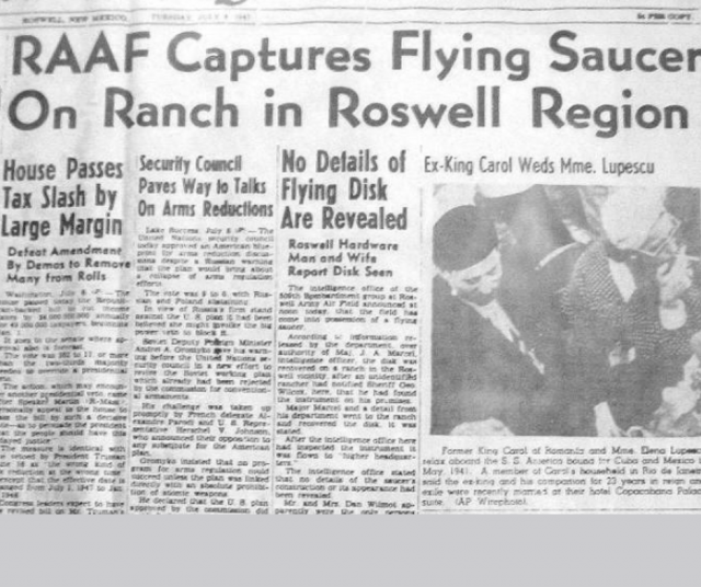 Heinäkuussa 1947 roswellilainen karjatilallinen W.W. Brazel löysi laitumeltaan omituisen läjän metallikalvoa, kevyitä puusoiroja, kumia ja nauhaa. Hän kuljetti löydön Roswell Army Air Fieldille, jonka tiedotusupseeri antoi pian lausunnon: tukikohta oli saanut haltuunsa lentävän lautasen. Paikallislehti Roswell Daily Record reväytti otsikon etusivulle, ja ufo-historia sai lähtölaukauksensa.
