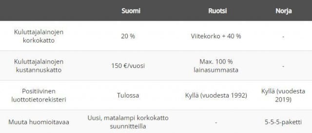 Tässä artikkelissa vertaillaan Suomen nykyistä korkolakia Ruotsin ja Norjan käytäntöihin. Kuten alta käy ilmi, on Suomessa tällä hetkellä kaikista matalin korkokatto, mitä ollaan mahdollisesti madaltamassa entisestään.