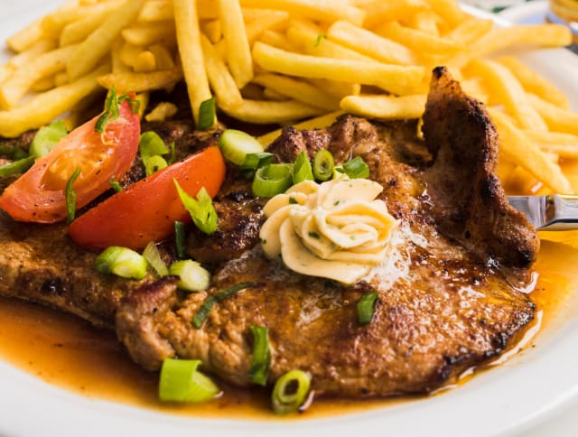 Ja sitten fiilistellään Pikku-Torren lehtipihvillä, jossa 150 gramman porsaan lehtipihvi kohtaa täydellisesti sulavan maustevoin ja rapsakat ranskalaiset.