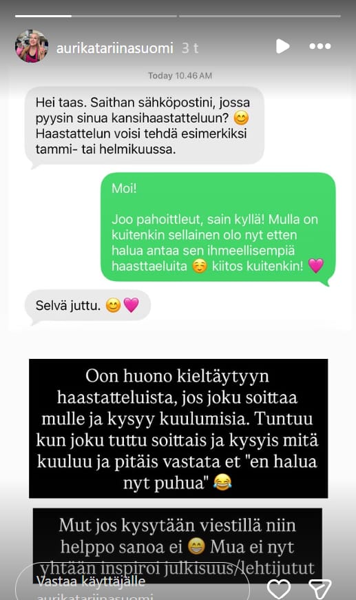 Avoimuudestaan huolimatta Kananen on viime aikoina vetänyt rajaa julkisuuden suuntaan. Hän kertoi Instagram-tarinoissaan kieltäytyneensä lehden kansihaastattelusta ja julkaisi kuvakaappauksen viestinvaihdosta toimittajan kanssa.