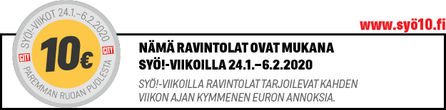 SYÖ!-viikot 24. tammikuuta – 6. helmikuuta 2020 Helsingissä, Espoossa, Vantaalla, Turussa, Tampereella, Lahdessa ja Tallinnassa. Tsekkaa kaikki kympin annokset: www.syö10.fi. Jätä kuva SYÖ!-raflasta hashtagilla #SYÖ10