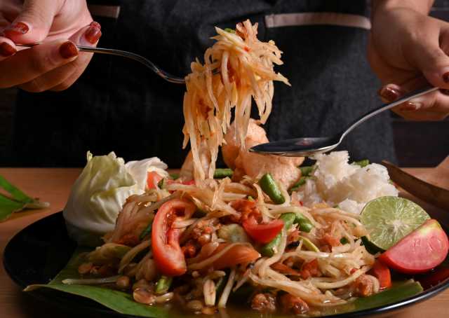 Huikean alennusprosentin omaava annos sisältää raikkaan thaimaalaisen papaya-salaatin sekä valintasi mukaan joko grillattuja possuvartaita tai tofua. Tätä et halua missata!