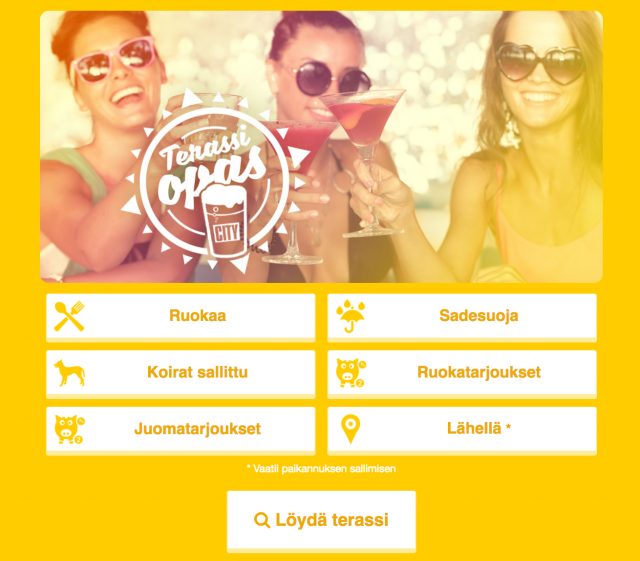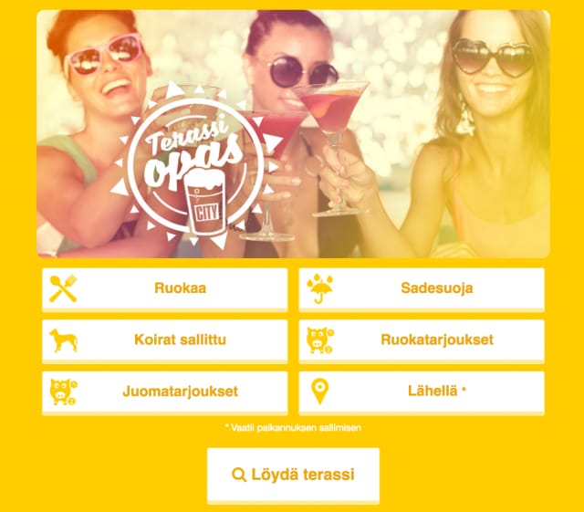 Oikean terassin etsinnässä auttavat myös filtterit, joista voit valita haluatko terassille, josta löytyy ruokaa, sadesuoja tai mahdollisuus ottaa koira mukaan. Voit etsiä terasseja myös sijaintisi perusteella sallimalla laitteesi paikannuksen.