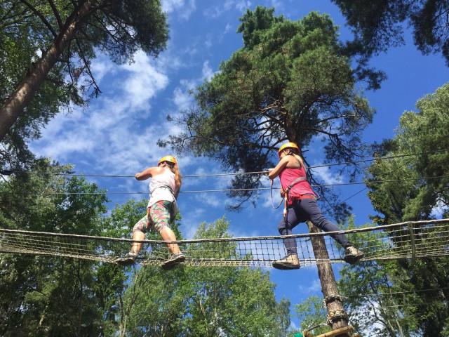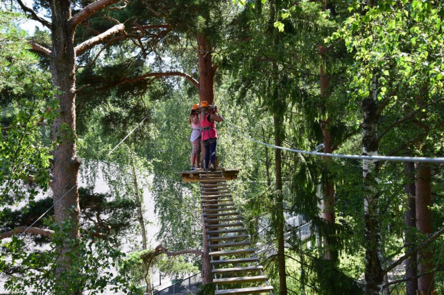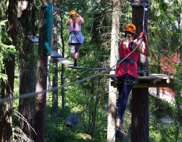 Lähdimme rohkeasti kohti korkeuksia. Edessämme näkyi kaikenlaisia verkkoja, puupölkkyjä ja tikkaita. Reittejä pitkin edetään trapetsien, tikkaiden, kiipeilyseinien, verkkojen, keinujen ja vaijeriliukujen avulla. Leikki vaikutti ensin helpolta ja vaivattomalta, mutta pian huomasimme olevamme väärässä. Luonnon sekaan rakennetut radat ovat erittäin fyysinen, mutta samalla hauska kokemus.
