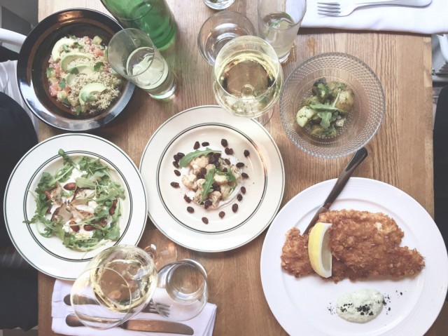Palvelu on ripeää ja ystävällistä, ja tarjoilija suosittelee mielellään annoksia, joita kannattaa maistaa. Valitsemme tarjoilijan suosituksesta mozzarellaa artisokan kanssa, kukkakaalia vuohenjuuston kera, havailijaisen poke-lohisalaatin sekä rapeaa kanaa ja perunasalaattia. Alkujuoman kanssa maistelemme juustoja ja lihoja ja leikimme olevamme Keski-Euroopassa (se on täällä helppoa). Annokset tuodaan pöytään eri näköisillä ja kokoisilla lautasilla, jotka lisäävät mutkattomuuden tuntua.