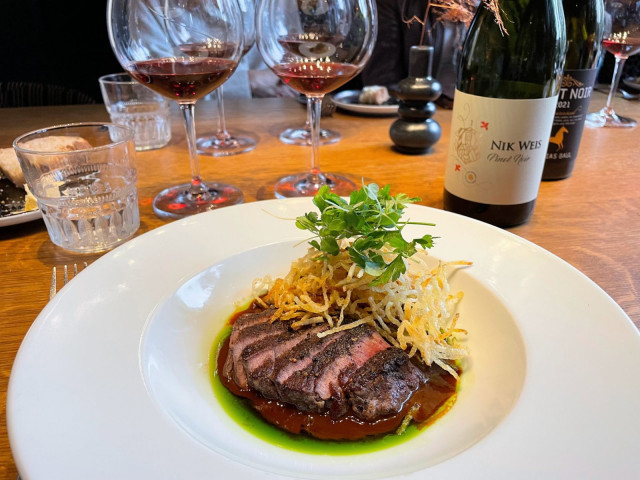 Pääruoaksi nautitaan Black Angus -naudan sisäfileetä rapean perunan ja pippurikastikkeen kera. Annoksen kanssa nautitaan täydellisesti mausteisen kastikkeen kanssa yhteensointuvaa Nik Weis St. Urbans-Hof Pinot Noiria vuodelta 2020. Ja paritushan toimii!