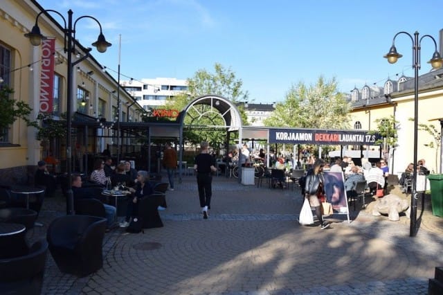 Kulttuurikeskuksen terassipiha on juuri sitä mitä aikuiset tarvitsevatkin, eli aikuisten leikkikentän. Keinuja sun muita ei sieltä löydy, mutta siellä on kaikkea muuta mistä ihana terassipäivä on tehty. Piha on laaja, siellä on lukuisia pöytiä ja mukavia penkkejä, nurmikkoa ja puisia aurinkotuoleja. Illan hämärtäessä aluetta tunnelmoi salaisen puutarhan -tyyliin puusta puuhun kiinnitetyt valot. Kesäpiha palvelee monimuotoisesti: sisätiloista löytyy Korjaamon ravintola ja baaritiski, ulkona toimii grillimestari välineineen ja sisääntulon vierustalla tarjoillaan sushia. Korjaamolla on laaja ohjelmatarjonta, jota kannattaa tsekkailla sen tapahtumasivulta.