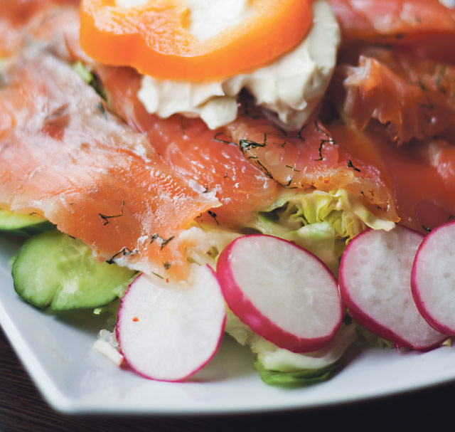 Pohjana toimii paahtoleipämäinen vaalea leipä. Sen päällä on kourallinen rapeaa salaattia, toinen kourallinen graavilohta, tomaattilohkoja, paksuhkoja kurkkuviipaleita sekä jylhä satsi majoneesia. Pièce de résistancena koko komeuteen on upotettu kokonainen retiisi ja sitä ympäröivä paprikasiivu. Kala on tuoretta ja hyvää – joskin suolatonta. Annoksen hallitsevana makuna on kuitenkin majoneesi. Kruunumajoneesi, epäilen.