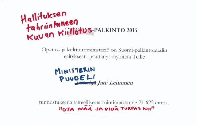 Suomi-palkinnon saanut Jani Leinonen käytti tilaisuuden kritisoidakseen hallituksen “rasistista, synkkää ja epäinhimillistä” politiikkaa