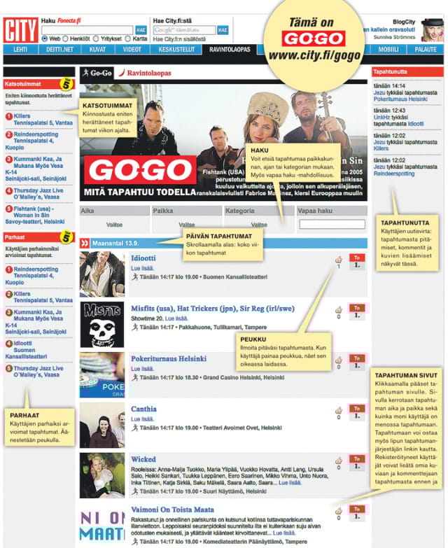 Vaikka itse sanonkin, se on aika huisi. Netin yhteisöllisin menopalvelu Go-Go on avannut City.fi:ssä. Valtakunnan kattavimpaan – uskallamme väittää – menokalenteriin voit lisätä omia kommenttejasi, kuviasi, tulevaisuudessa myös videoitasi tapahtumista….