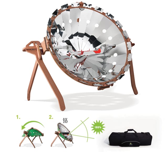 Kypsennettävä ruoka asetetaan lautasantennia muistuttavan grillin keskiosaan. Grilli käännetään kohti aurinkoa, jolloin keskusta kuumenee jopa 200-asteiseksi ja kypsentää ruuan. Pienet ruuanlämmittimet maksavat 50 euroa, suuremmasta grillistä saa pulittaa 500. Sama yritys myy myös aurinkoenergialla toimivia tupakansytyttimiä. Ostajat toivovat aurinkoista kesää.