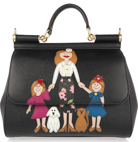 Laukku on osa "Viva La Mamma" -mallistoa. Sen on pakko olla suunnittelijansa heikoin hetki elämässä, niin järkyttävältä tämä olan yli heilautettava tyylirikos näyttää. Laukkuun on sijoitettu yksinkertaiset ihmisriekaleet, jotka esittävät äitiä ja kahta lasta, lemmikkieläimiä unohtamatta. Kuten huomaatte, keskellä kärsivä äiti on ainoa, joka ei hymyile.