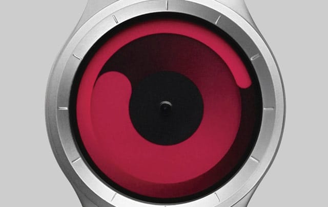 Kuten sisarkello Gravityssä, Mercuryssakin sisempi spiraali merkkaa tunteja, ulompi minuutteja. Kello on 10.12. Metalliranneke, neljä väriyhdistelmää. 149 e.